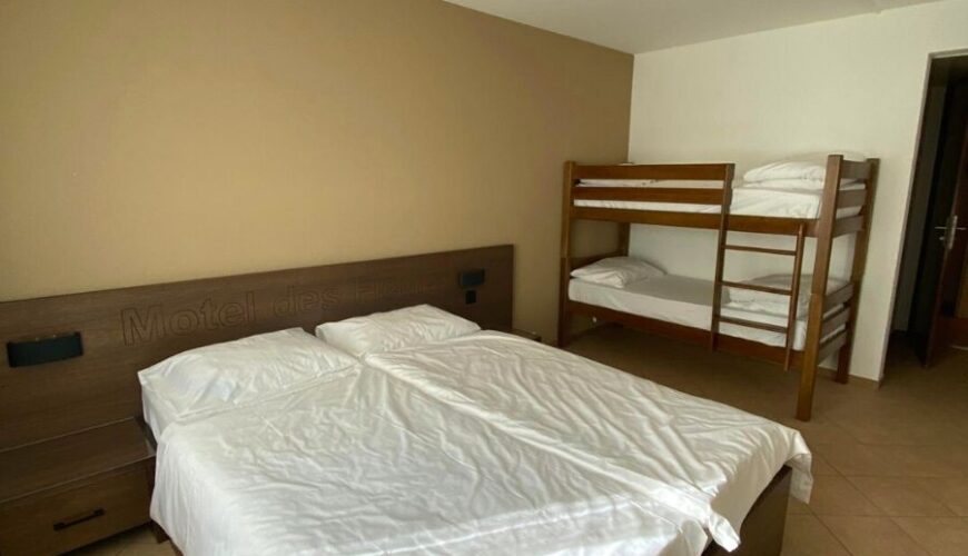 Nos chambres famille entièrement rénovées sont toutes équipées dans un lit double, d’un lit superposé, d’un coin bureau, d’une télévision à écran plat et d’un petit frigo.